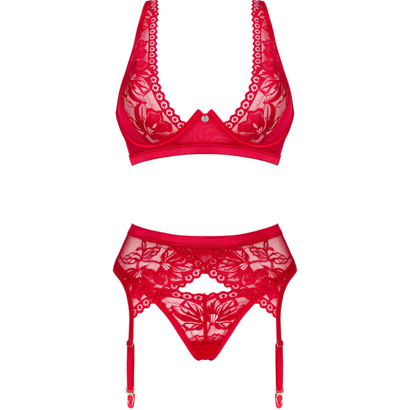 - A three-piece red set containing a bra, thong and garter belt