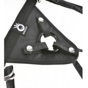 The heavy-duty vinyl harness keeps everything in place even when the action heats up. The form-fitting design hugs your bodys contours and gets even softer and more fitting with each use. With a completely adjustable thong strap and waist straps, it comfortably fits waists up to 52-inches. The metal belt buckles ensure it wont come loose during the fun, while the velcro straps hold the O-ring securely in place.